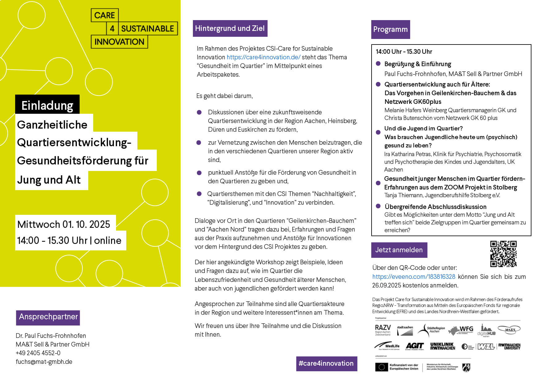 In unserem Online-Workshop am 01.10. möchte wir mit den Teilnehmenden diskutieren, wie wir im Quartier Maßnahmen anstoßen können, die die auch psychische Gesundheit von jungen und alten Menschen im Quartier fördern. Dabei möchten wir auch diskutieren, was unter dem Motto "Jung und Alt treffen sich im Quartier" hierbei möglich ist.