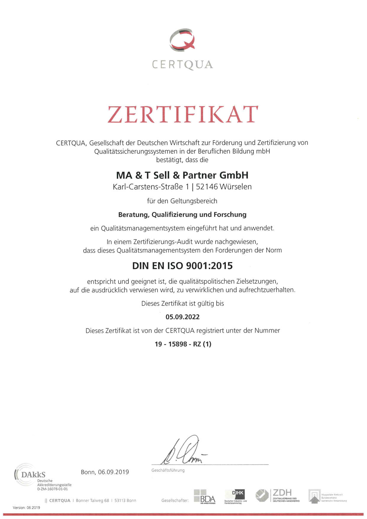 Am 29.08.2019 wurde unser Qualitätsmanagementsystem nach DIN EN ISO 9001:2015 von der CertQua rezertifiziert. Das Audit ergab keine Abweichungen! Wir sind also nach wie vor sehr gut aufgestellt, um im Sinne unserer Kunden, Lieferanten, Mitarbeiter*innen und Kooperationspartner verlässlich und nutzenstiftend zu agieren.